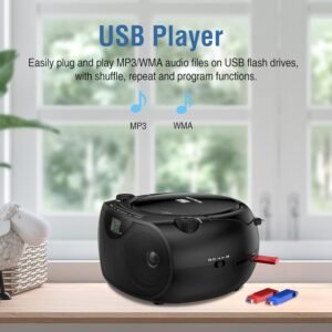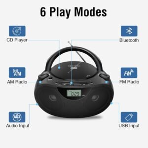 $14.99Product Description Portable CD Player Boombox with Bluetooth Wireless Streaming, AM/FM Radio and USB Port A top-loading CD/CD-R/CD-RW player...
