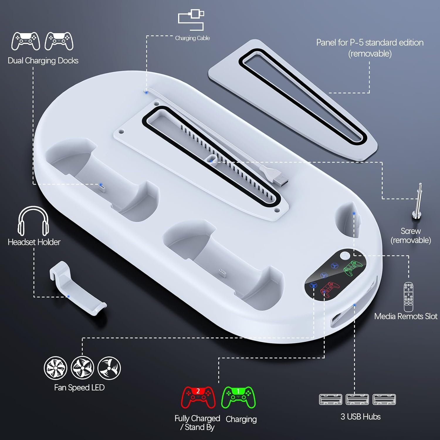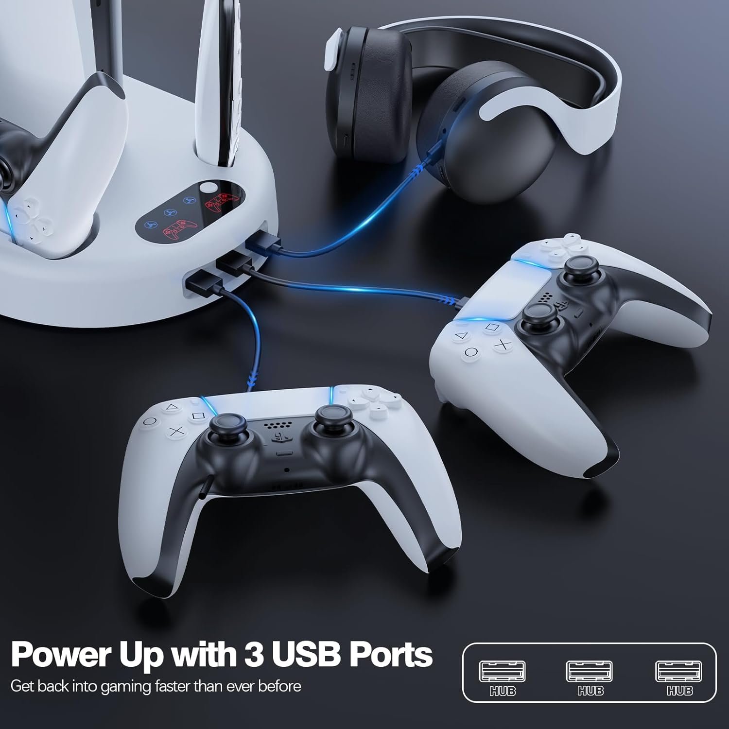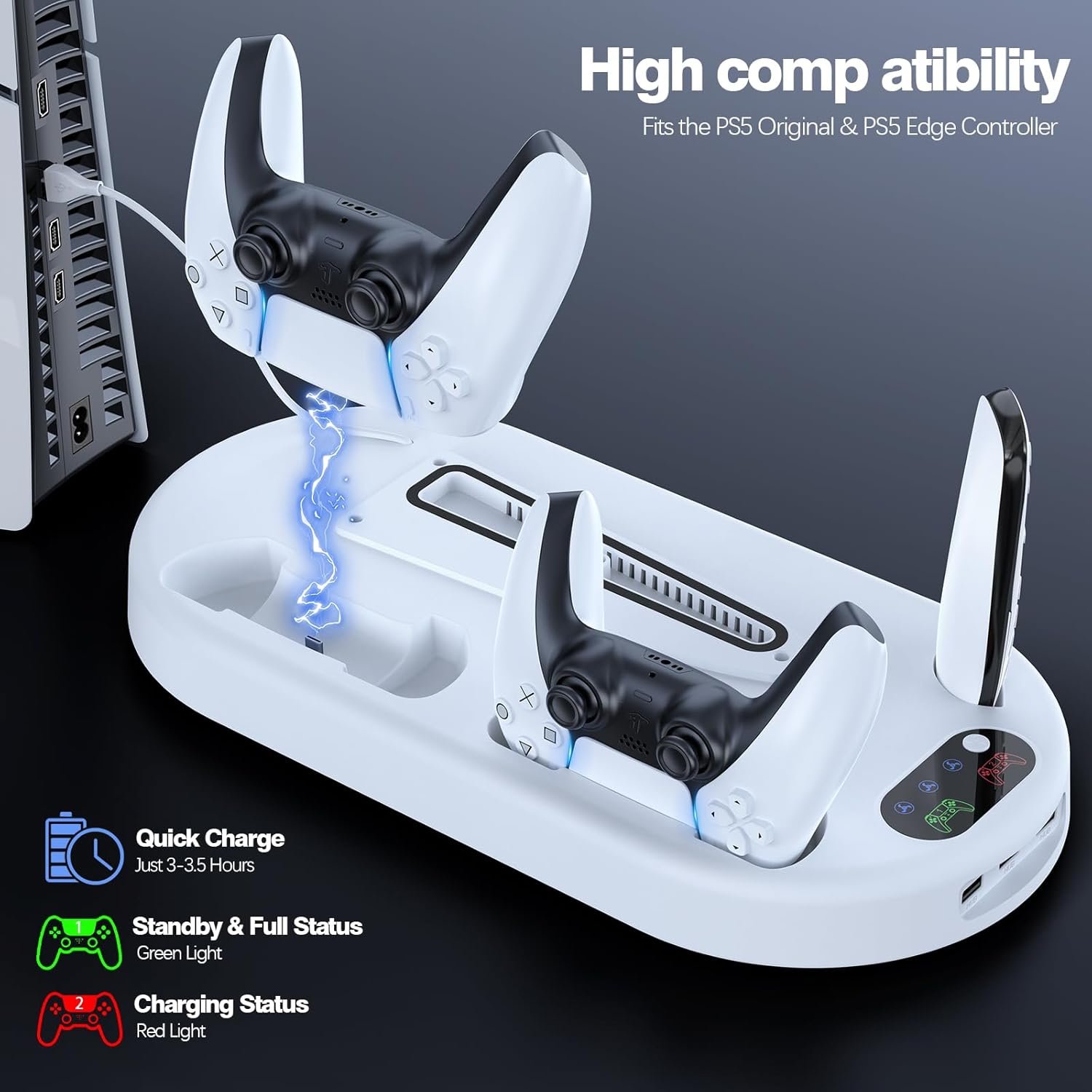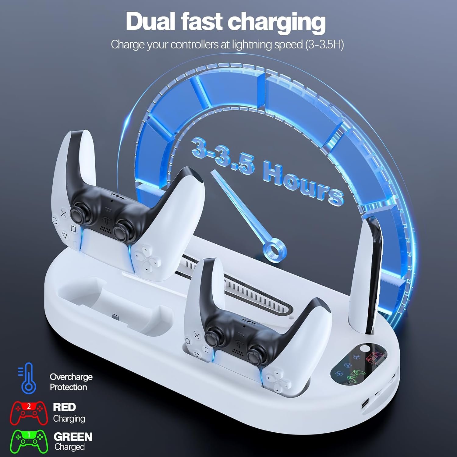 Fast Charging: Keep your PS5 wireless controllers fully charged and ready to go with the dual charging station featuring LED indicators. Simply place the controllers on the charging dock, and they will begin charging automatically and ensure that your controllers are fully replenished in under 3 hours.