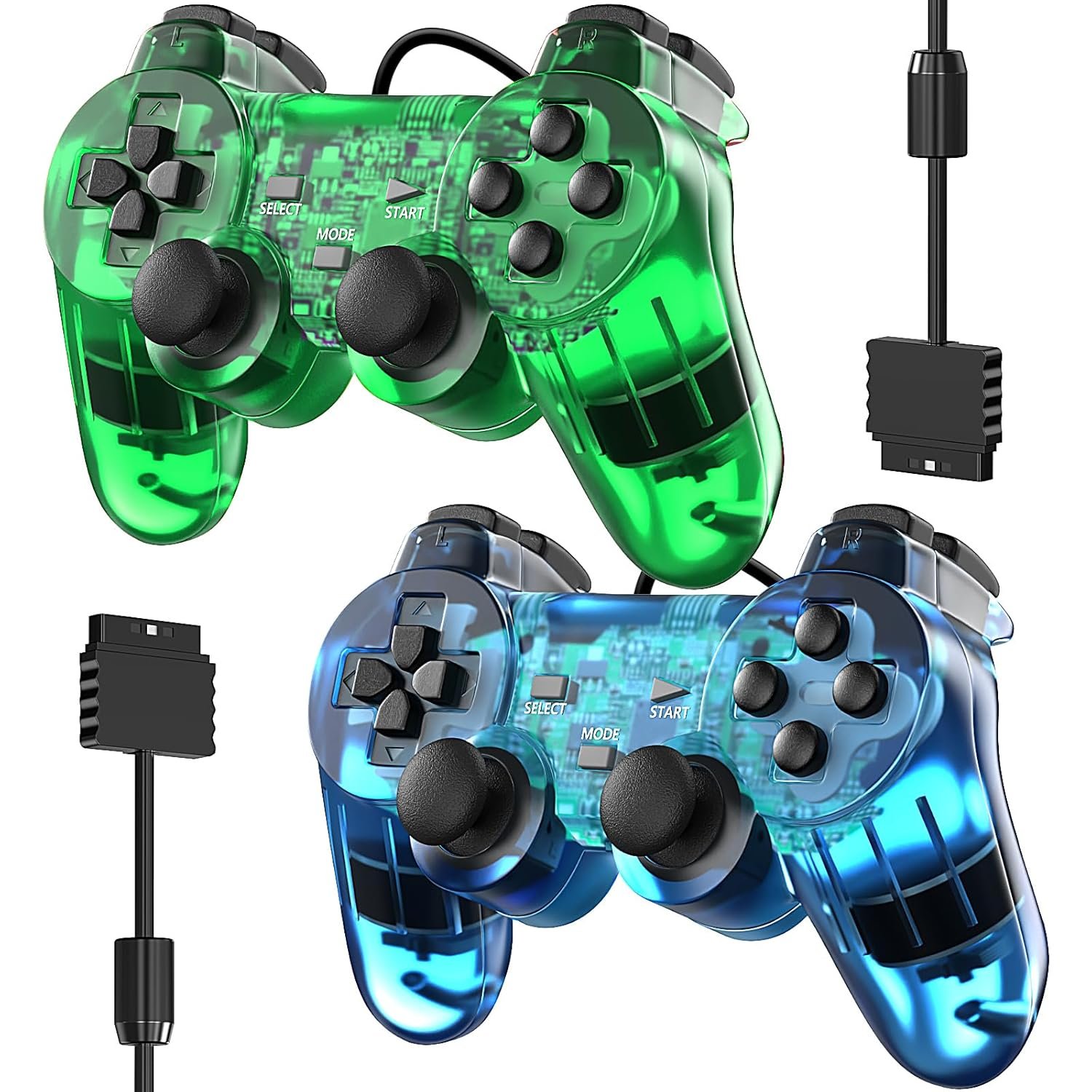 Degulan Wired Controller for PS2 Double Shock, 2 Pack Gamepad Remote Compatible with Play station 2 (Clear Green and Clear Blue)