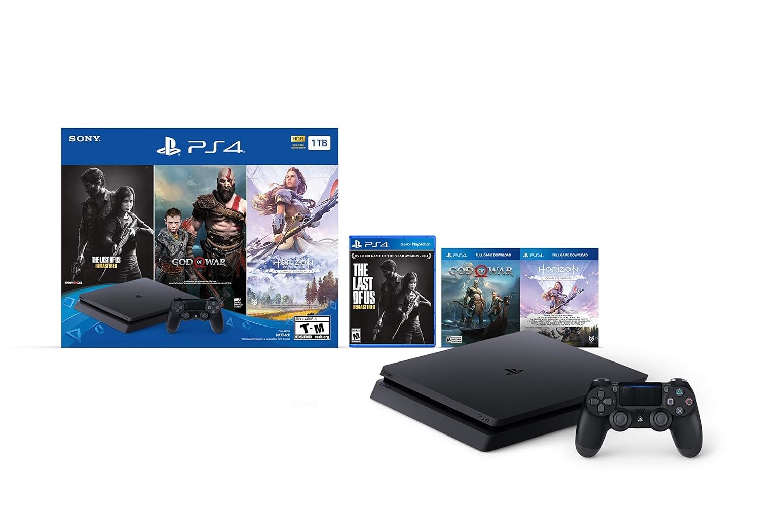 Only on Playstation PS4 bundle includes a Jet black 1TB PS4, matching Dualshock4 Wireless Controller, God of war, the last of US remastered, and Horizon Zero Dawn: complete Edition games.