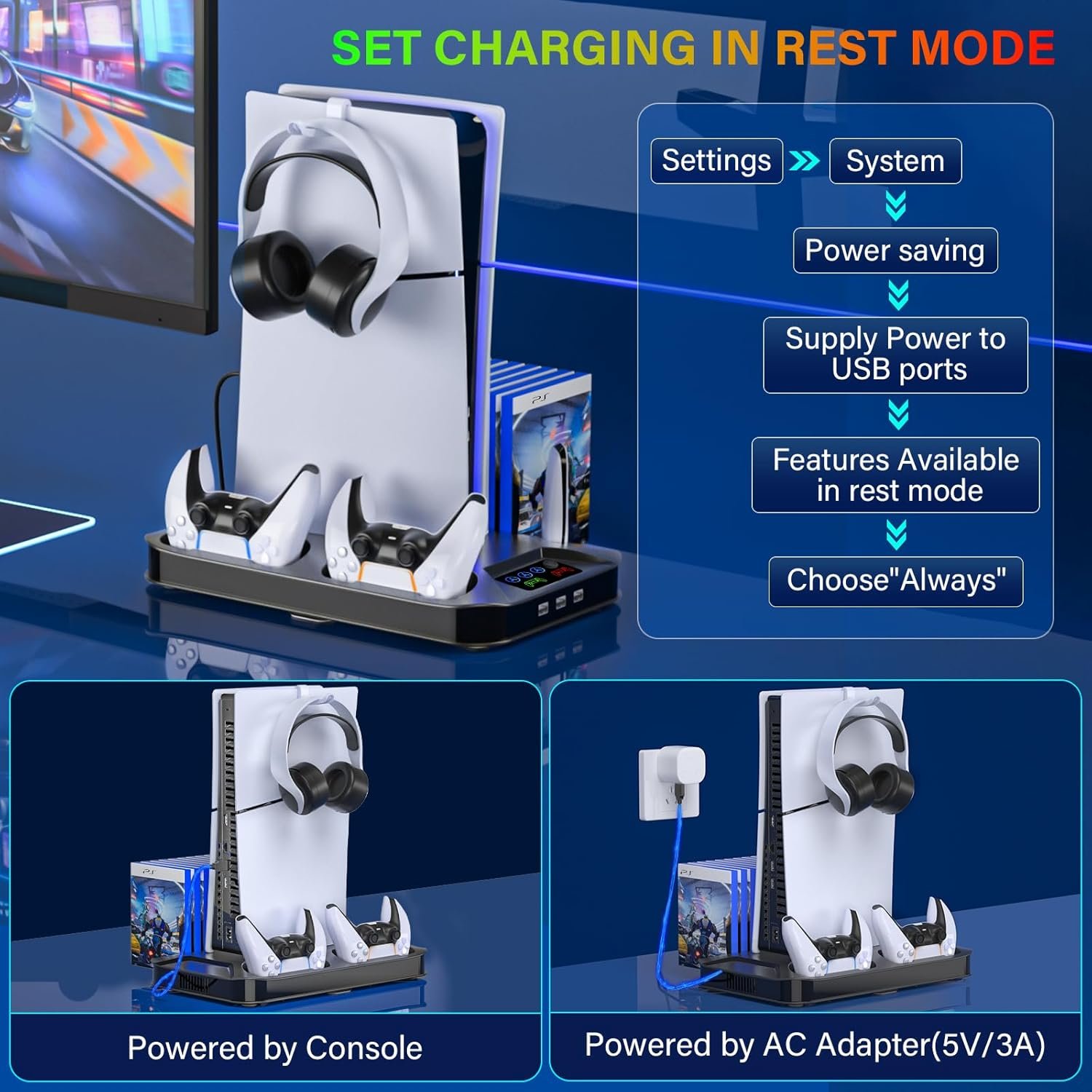 Extra 3 USB charging ports to charge ps5 controllers, headset, phone and other devices.