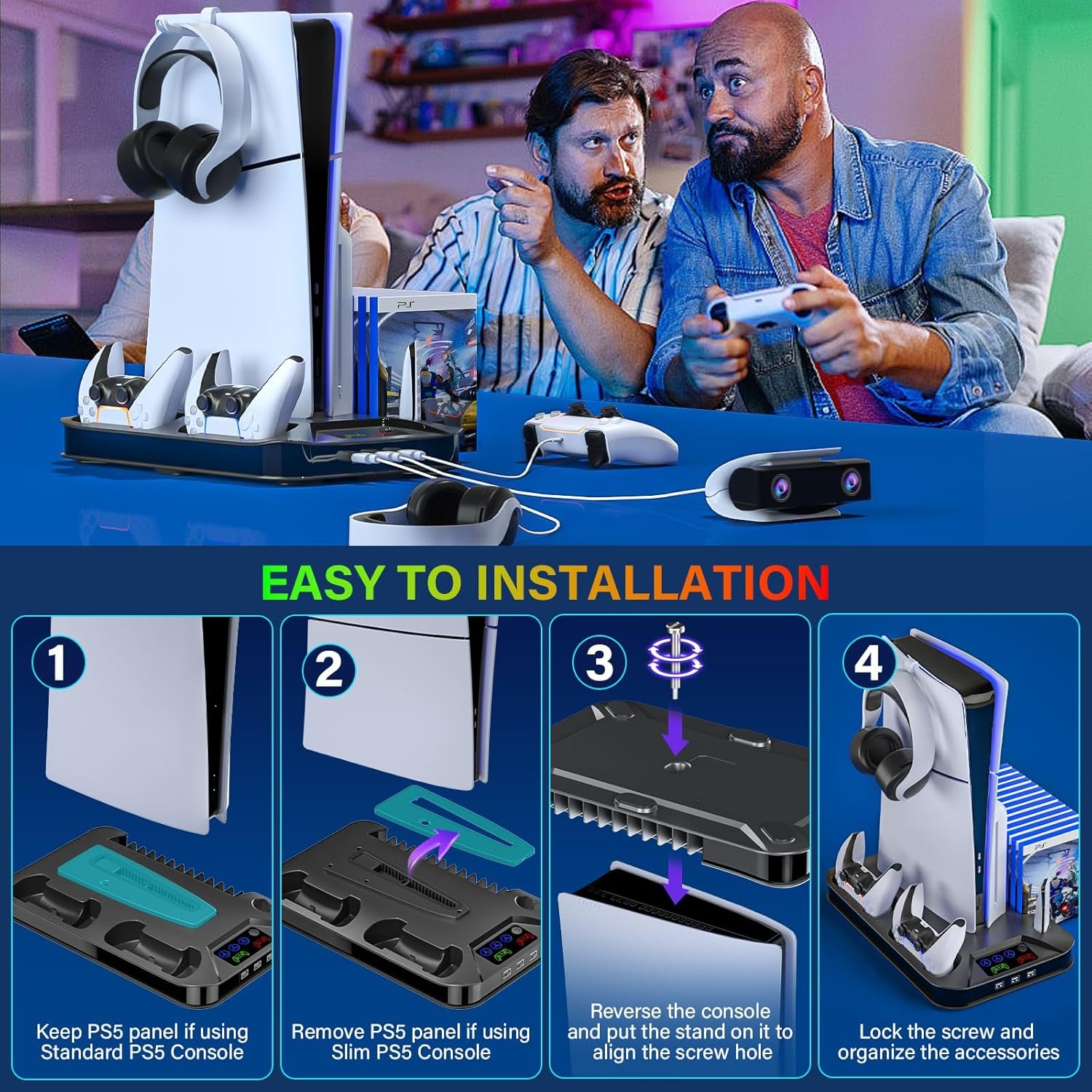 A MUST-HAVE PS5 COOLING FAN STAND: It’s a must-have cooling station and charging station for ps5 console and ps5 controller(Not for edge controller)! The ps5 slim cooler station has 2 charging docks for ps5 controllers, a media remote slot, a headset holder, 3 USB ports and a cooling fan. Package List: PS5 Cooling Stand *1; Headset Holder *1; PS5 Panel(attached on the stand) *1; Screw*1. Please feel free to contact us if there is any problem with products from our Kammkonb
