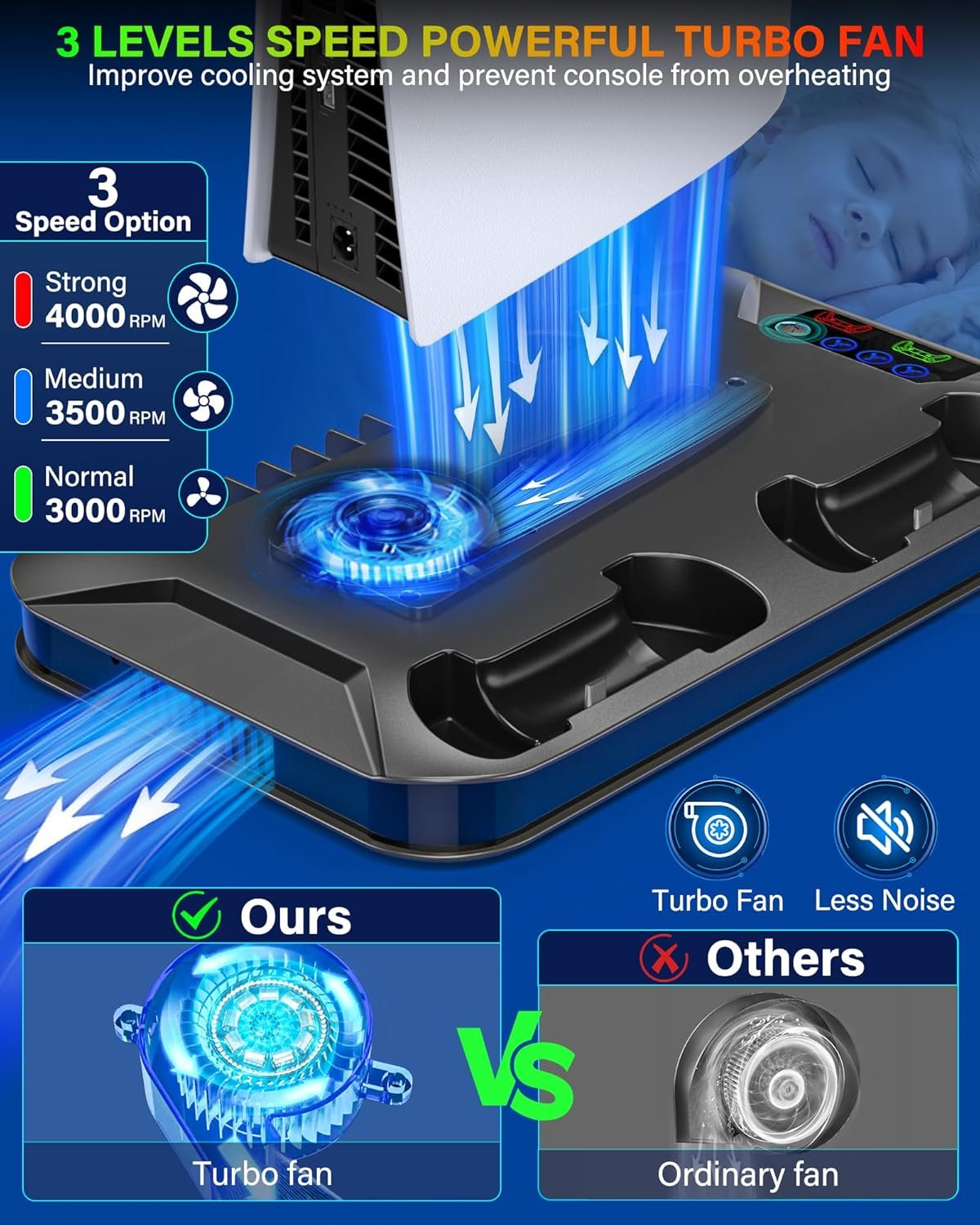 PS5 COOLING STAND WITH 3 SPEEDS TURBO COOLING FAN: The ps5 stand with cooling fan and controller charger has a hight-efficent turbo fan to greatly cool down your ps5 console by dissipating the hot air from the bottom of console even during long gameplay sessions, helping it stay away from overheating and extending its service life. The cooling fan in this ps5 slim vertical stand can be adjusted to High, Mid, Low 3 speeds to meet your different need
