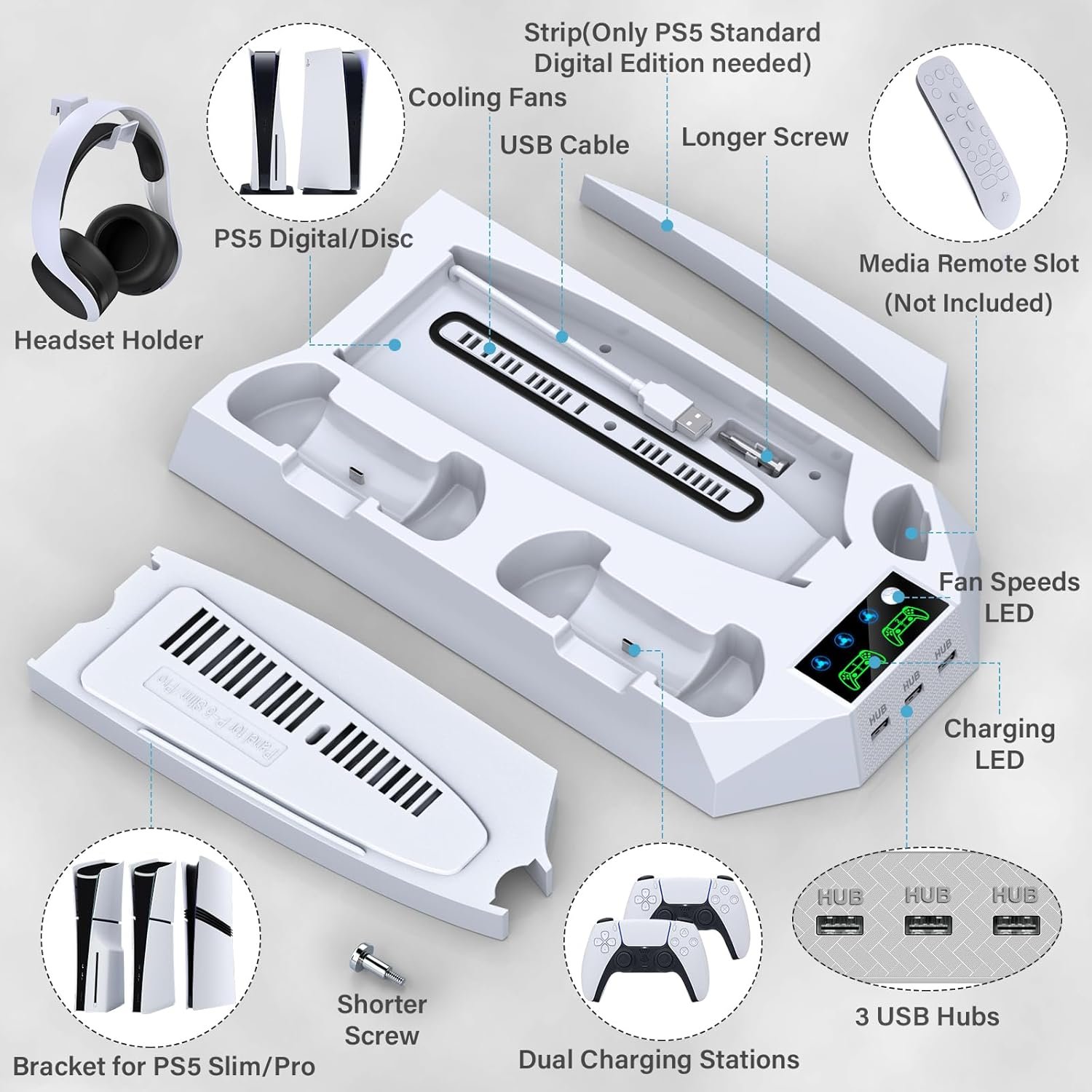 FOR 2023 PS5 SLIM & 2020 PS5 STANDARD DIGITAL & DISC VERSION CONSOLE: This ps5 slim cooler stand vertical took into consideration both ps5 console digital edition as ps5 console disc version, also comes with a special digital strip for the ps5 digital console and a safety SCREW to attach to the ps5 console system, both will make the docking station more secure and balanced, compact size help to save space & increase gaming room’s space efficiency. A perfect way to store and display all ps5 assecories and console