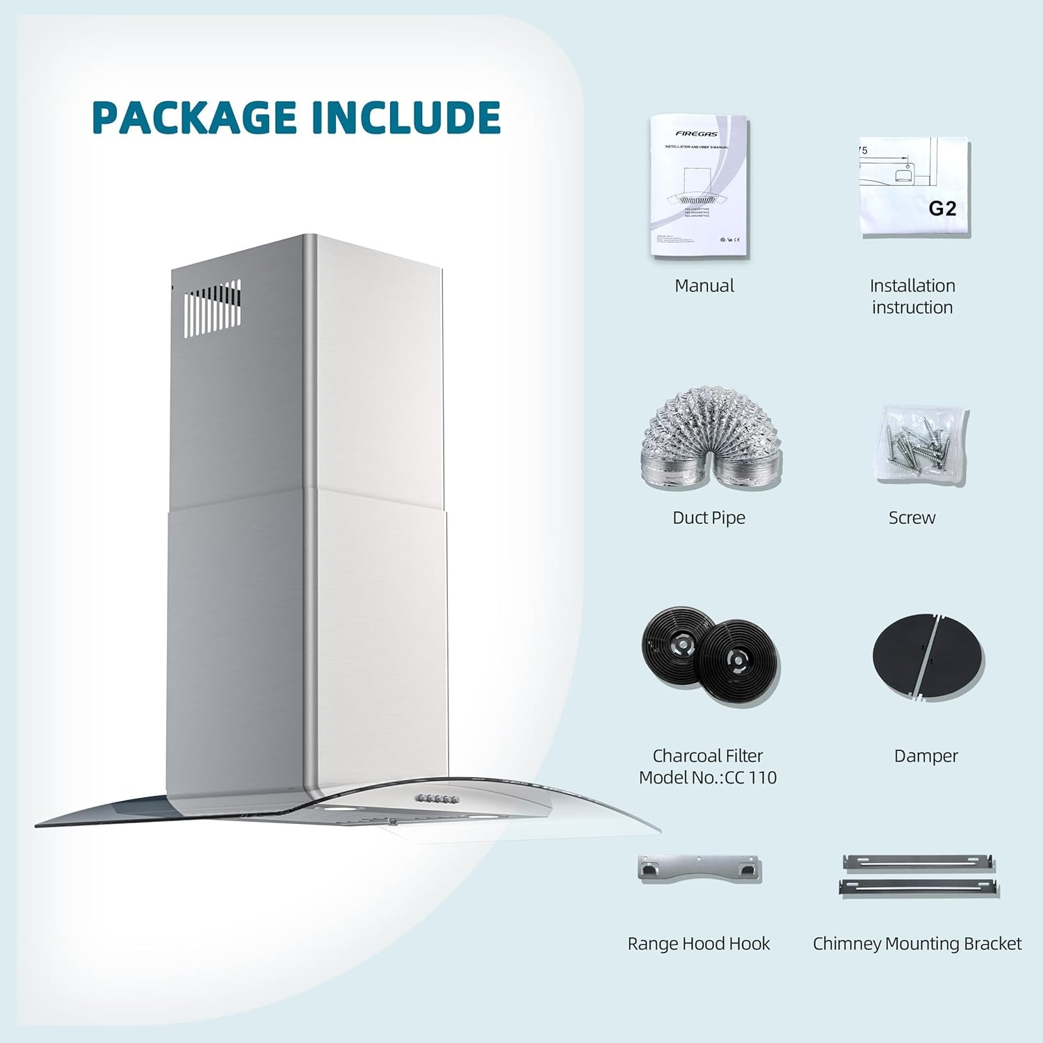 DUAL VENTILATION MODE: FIREGAS range hoods can be ducted or ductless. Duct mounted cooker hoods allow the air to be exhausted to the outside. Ductless installation allows for air circulation in the room. The two-piece carbon filter kit (model: CC110) that comes with the range hood can be used for ductless ventilation.
