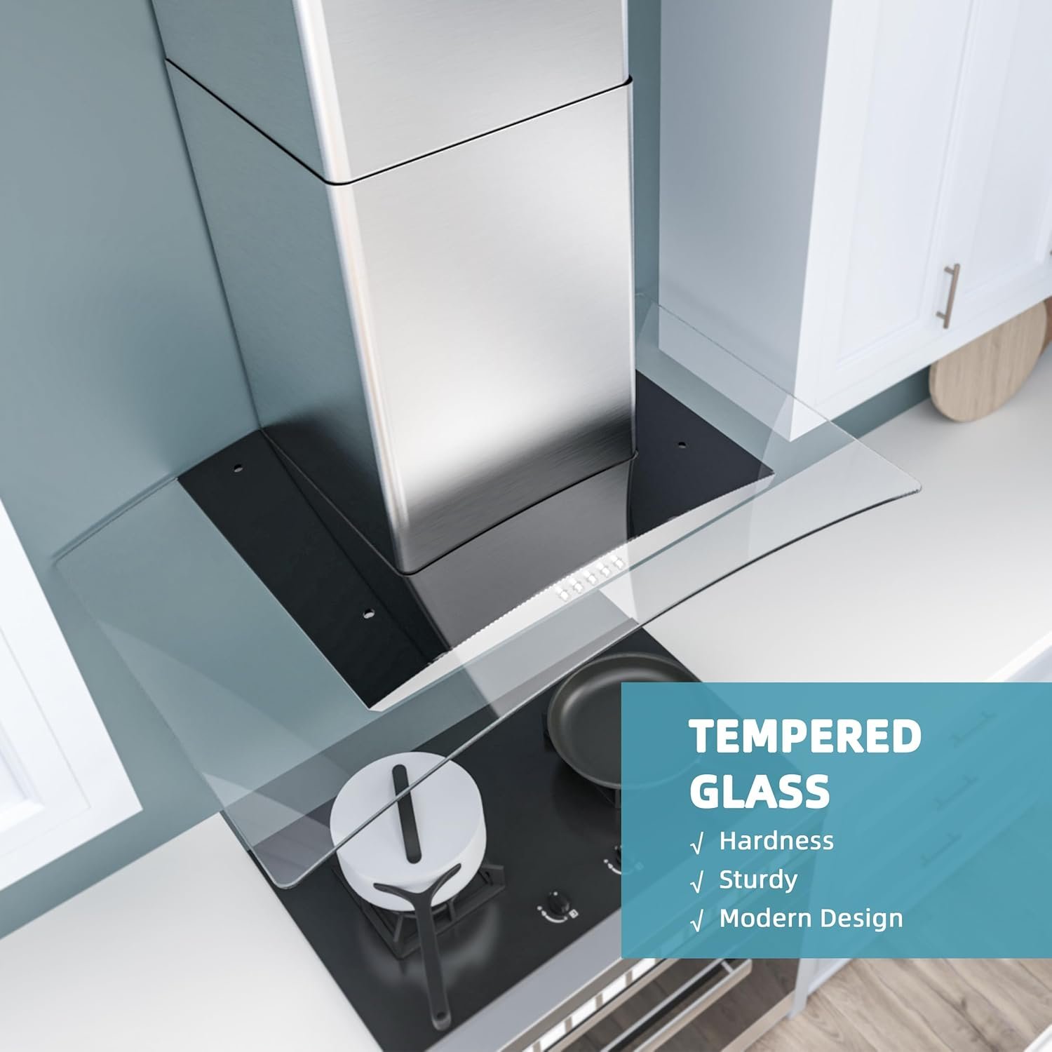STAINLESS STEEL RANGE HOOD: This 30 inch range hood is constructed from high end 430 stainless steel with a brushed finish and glass. The rust-resistant properties of stainless steel make it durable and easy to clean.