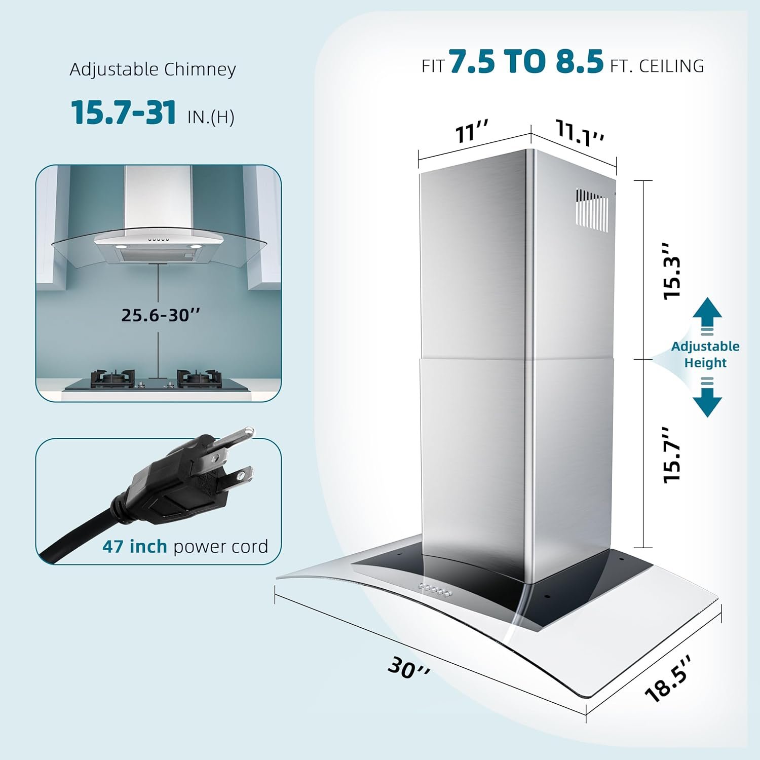 PRODUCT DIMENSION AND ADJUSTABLE CHIMNEY: Range Hood Dimensions: 30 in. (W) x 18.5in. (D) x Adjustable 15.7 in. – 31 in. (H). The range hood 30 inch has adjustable extension chimney (FGS-TG33S-ZST) and is perfect for 7.5-ft ceiling or 9-ft ceiling.