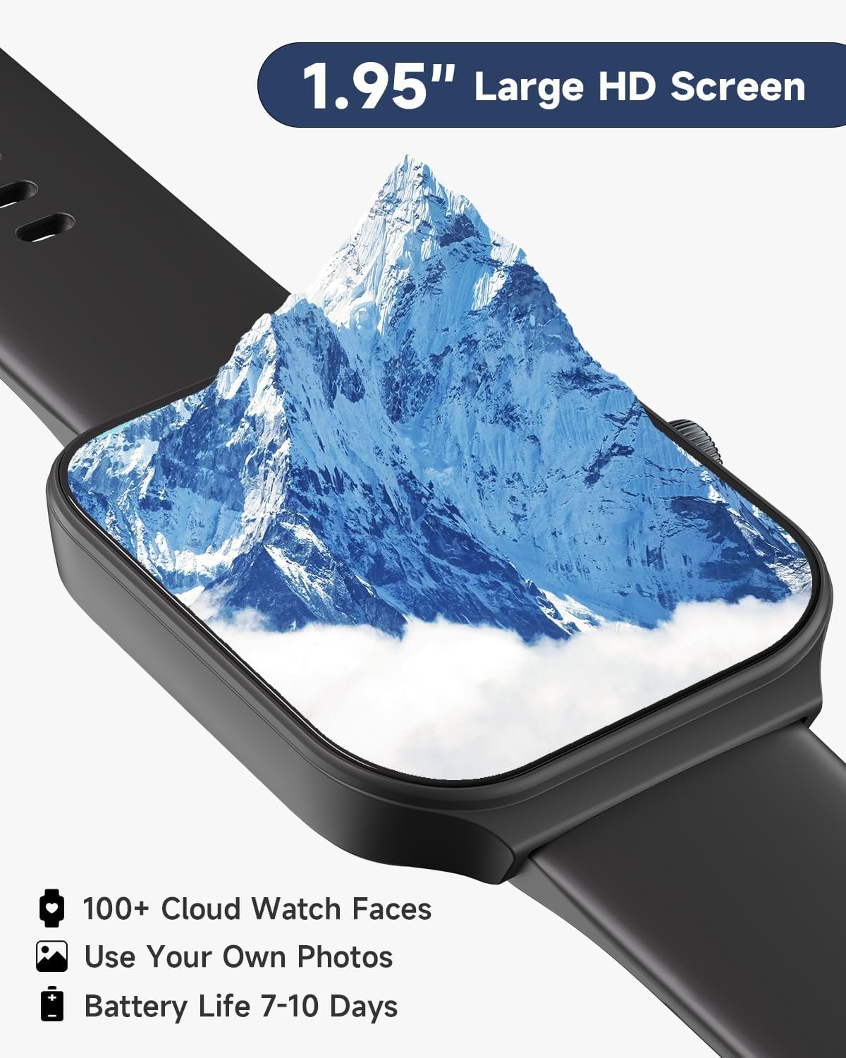[1.95” HD Screen & Customizable Watch Face] Experience crystal-clear visuals like never before with our smartwatch’s 1.95-inch high definition screen. Choose from 100 beautiful cloud-based watch faces or even upload your own photos, such as selfies or pictures of your pets, to create a truly personalized look. With endless possibilities, you’ll never run out of options to make your watch truly your own.